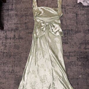 Sage green satin floral maxi dress by Cider, women's size large. Like new, worn once. Features a backless design, lace detailing, and a large bow. Price is negotiable.