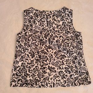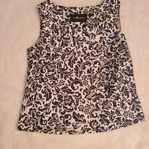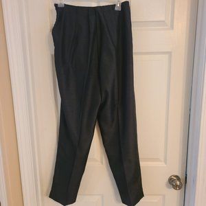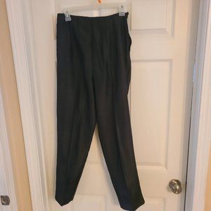 Sage Harbor 3 piece suit, back and white. Jacket is 25 1/2 back length, roll cuff sleeves. Sleeveless top, black and white, 17" front length. Black slacks, side zipper tapered legs, 27 1/2 inner thigh length. 100% polyester. Very professional looking, but easy care and light weight. All pieces are size 8.