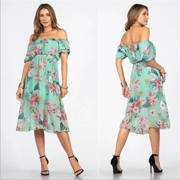 Sage Mint Floral Off Shoulder Midi Dress | Boho Spring Summer Outfit
