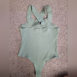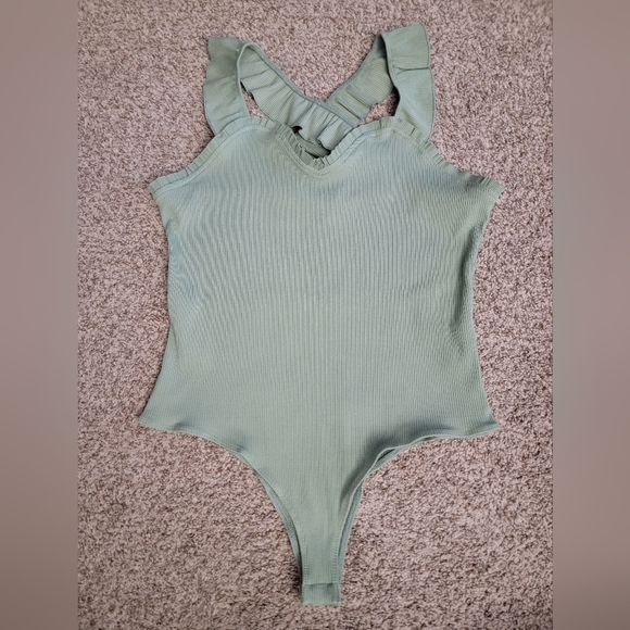 Chic ribbed bodysuit in a soft sage hue. Ideal for everyday wear, only worn once. so cute with the criss cross back and ruffled detail.