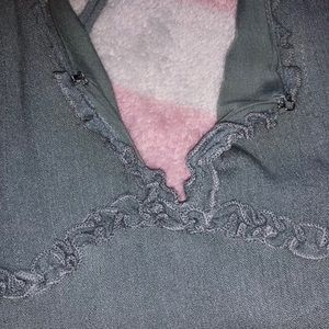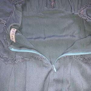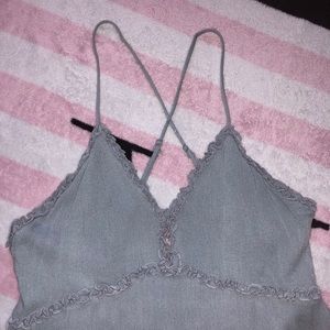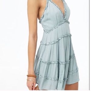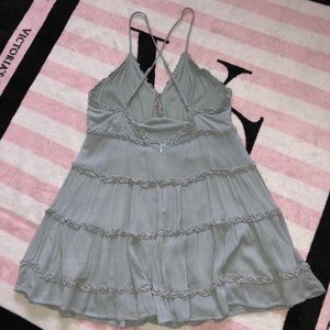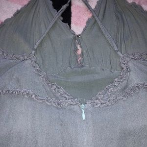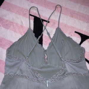 Sage green frill ruffle mini dress with low back and criss cross adjustable straps. Clip clasp at v-neck and zipper back.