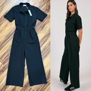 This cute black jumpsuit by Sage combines a utility-inspired design with a chic, contemporary style. Featuring an elastic waist and wide-leg silhouette, it offers both comfort and sophistication for any occasion.
