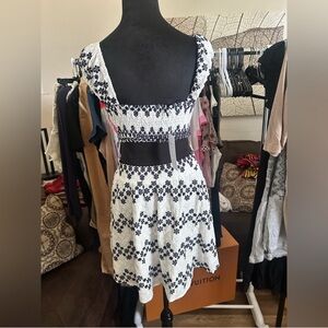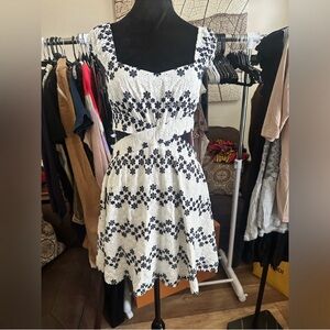 This chic sundress by Sage features a striking navy blue and white eyelet fabric. It boasts a square neckline and flutter cap sleeves, adding a playful touch to its design. Its backless style enhances the breezy, summer-ready appeal.