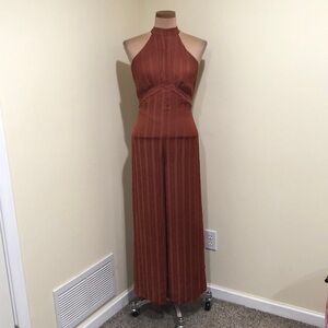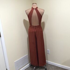 Excellent condition no stains rips or fading. Halter neck, wide leg, cut out open back jumpsuit. Not stretchy. Zips in back. This brand is sold at Anthropologie.