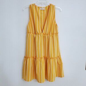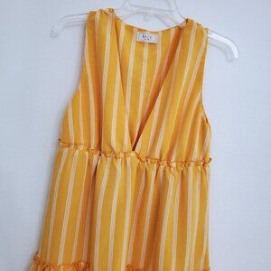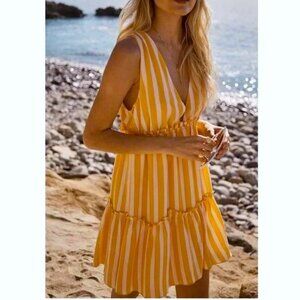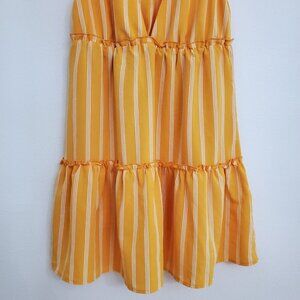 By SAGE THE LABEL here is a fabulous dress for summer. It is light and airy, called “ST.TROPEZ”. It is done in White and Marigold Stripes and fully lined in white.It features a ruffle trimmed very low v neck and a soft flowy skirt from the Empire Line. The hem is trimmed in a deep ruffle.