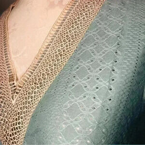 New with tag Sage green short petal sleeve embroidered contrast tan V Neck textured top size medium. Measurements in photo.