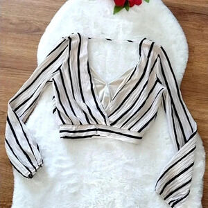 Women's Sage the Label V Neck Punge Long Sleeve Crop Top, Size XS, Excellent Gently Used Pre Owned Condition, No Stains or Holes, Snap Button at Bust, Cream Light Taupe with Black Stripes. Smoke Free Home, Fast Shipping!