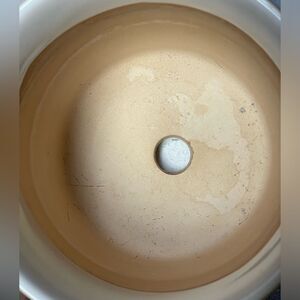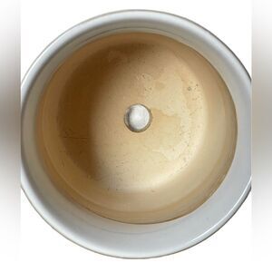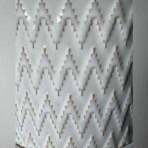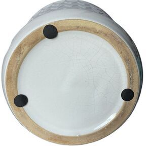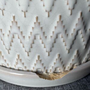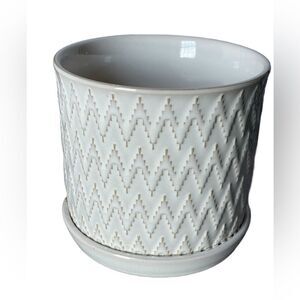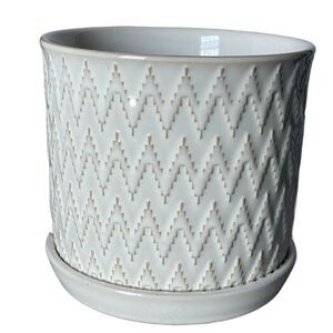 This beautiful minimalist designed planter will look stunning in any room of your home or at your office. It stands about six inches high and six across the top, so it is medium sized. This ivory piece has beige chevron designs and a crackle effect throughout the ceramic. There is a large chip on the bottom of this planter, as shown in photos, but you will be able to turn it around so it’s unnoticeable. Some wear on the inside as well, but once your plant is in place you won’t be able to see it.