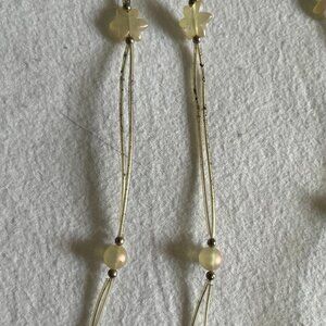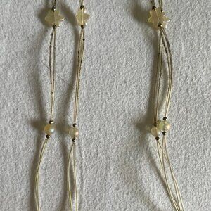 This unique purse has a sheer dark olive green overlay with embroidery. It is over a winter white material. That material is also the lining of the purse. There interior of the purse is in three (3) sections. One (1) side has a zipper pocket and the center is a zippered pouch. (The Sagi Made In Italy is on a matallic silver medalian on the inside of the purse which was difficult to photograph.) The handles are Clear Plastic with dark speckles. The handles are embellished with opal-style flowers and beads.