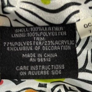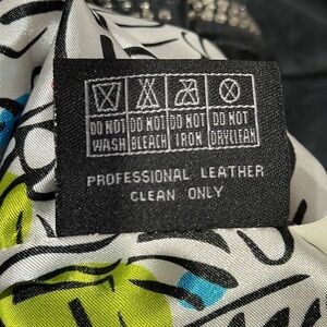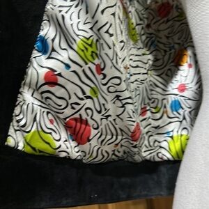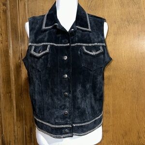 Super cute black suede leather vest with snap closure and beading detail. Removable faux fur collar. Two slant pockets and two snap closure patch pockets. Fun abstract fabric lining.
