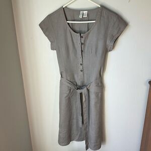 Sahalie 100% linen shirtdress. XS. Grey. Half button up, vneck, tie at waist. Cap sleeves, mini/midi length. Flat lay 38.5” L, 15.5” P-P. Superb quality, comfortable linen, capsule wardrobe. Jennifer Aniston vibe. Classic simplicity #linen #sahalie #friends