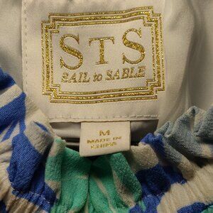 Sail to Sable Blue Palm Print Flutter Sleeve Ruffle Neck Top SIZE MEDIUM