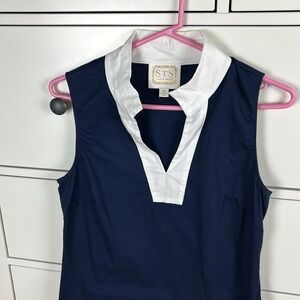 The Sail to Sable dress is a chic sheath, perfect for casual and work settings. Featuring a sleeveless design and a classic polo collar, this dress combines a structured silhouette with a stylish blue and white color palette. Ideal for resort wear, it offers a sophisticated yet relaxed look.