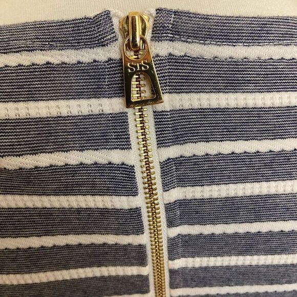 Navy blue and white striped shift dress. Exposed gold back zip. 3/4 sleeves. Casual. Nautical. Great with white sneakers or sandals. Preppy.