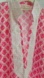 Chic pink and white dress. Features a geometric pattern. V-neckline with contrast trim. Three-quarter sleeves.