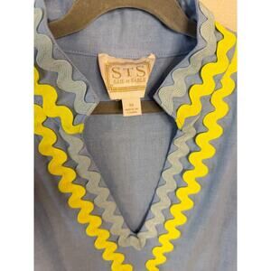 The Sail to Sable Size M Dress in light blue with ric rac trim and short sleeves is a stylish and comfortable option for casual or travel occasions during the summer and spring seasons. Made from cotton, this short dress featuring a shift style offers a flattering fit and easy care with machine washable instructions. With a brand known for quality and a classic design, this dress is a versatile and chic addition to any woman's wardrobe.