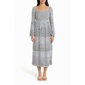 Sail to Sable Square Neck Smocked Dress Blue White Geometric Size XL