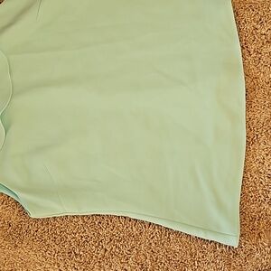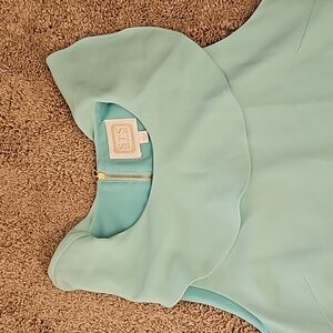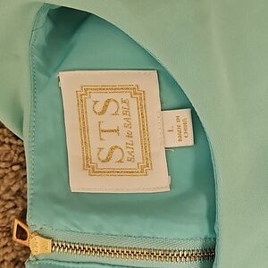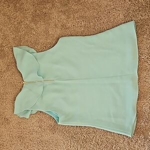Sail to Sable teal sleeveless blouse, collar at neckline is flowy, gold zipper at back neck