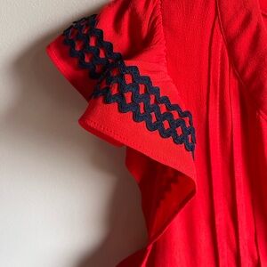 Stunning flutter sleeve tiered dress, lined inside and nice navy blue embroidered detailing along sleeves and skirt portion. Side zipper entry.