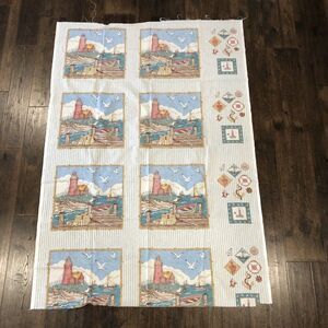 This fabric panel consists of 8 pictures of a lighthouse on the beach with sailboats, a pier, seagulls and a fishing basket. Each one is 13.5” x 14” and surrounded by a rope design trim. These panels would make great pillows or quilt centers. Along one side are some nautical medallion designs.