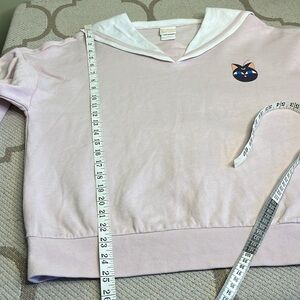 pink sweatshirt from Sailor Moon features an image of Luna on the left chest, sailor collar with "Chibi-Usa" on the back, drop shoulder and an oversized fit.