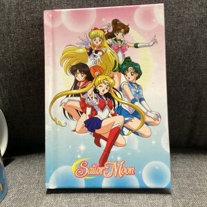 Sailor Moon themed mug, keychain, and notebook set. Features vibrant colors and iconic characters.