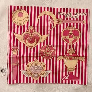 Small cotton handkerchief with pink and white stripes and art of the transformation brooch, moon stick, crisis moon compact, holy grail, disguise pen, and cosmic heart compact: 11.5" x 12"