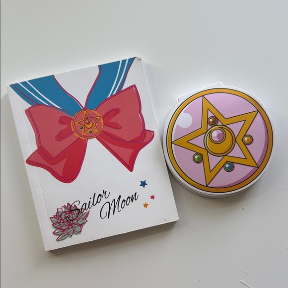 Sailor Moon themed notebook with a red bow design and a pink compact with star emblem