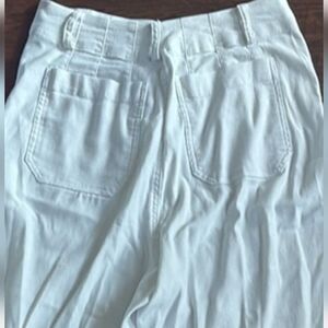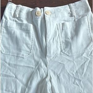 Stylish white wide-leg pants with front pockets and cute button closure with zip. Nice comfy stretchy fabric. The size tag is removed, but I'm listing it as an XSMALL because of measurements and how it fits me. These are high rise with fitted waist and hips. There is a small alteration in the back waistline for a sleeker look.