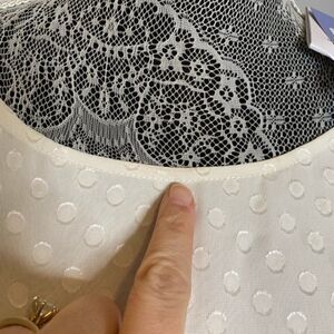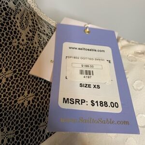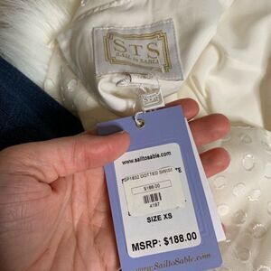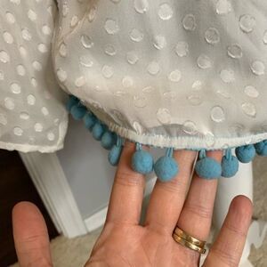 Sail to sable is known for their Gorgeous high end resort wear. This blouse is no exception. The fully lined blouse features fun teal pompoms on the bottom hem. Brand new with tag but does have small makeup mark on front from trying on... have not tried to launder it yet. Lying flat armpit to armpit approx 17” across and top of shoulder to bottom hem approx 24”
