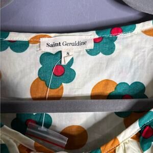 This Saint Geraldine top is a charming and feminine piece. It offers both comfort and breathability. The top showcases a delicate tan base adorned with a green floral print. The button front closure adds a classic touch, while the ruffle detailing enhances its feminine silhouette.