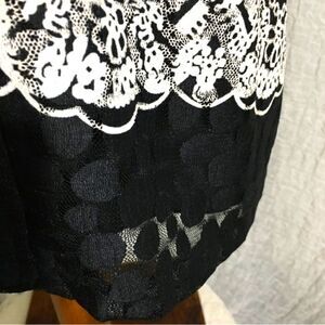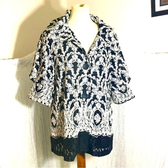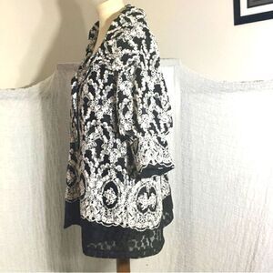 Beautiful Classy Black & White print cardigan. Big front buttons closure. Mid-size sleeves. *No size available best guess it's a comfy size large. Pre-owned in good condition. Please refer to pictures and measurements for best description, condition verification, and fit.