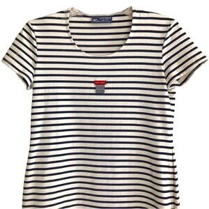 Classic Nautical Saint James Breton Dress in Navy Stripe with short sleeves, above the knee length, front center chest Logo. Made in France, Classic Resort/Yacht Wear, stretchy polyamide & lycra.