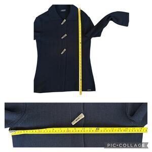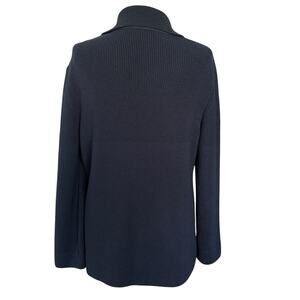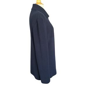 Pure New Wool cardigan in navy blue. 3 button closure. Large buttons. Well made and heavier knit.