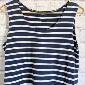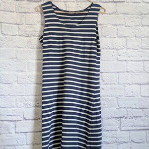 Saint James Striped Midi Dress. Size US 8. Navy blue and white stripes. Round neckline. Sleeveless. Side slits at hemline. Pullover styling. 100% cotton. Unlined.
