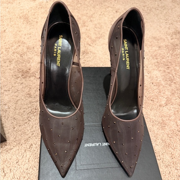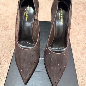Chic Saint Laurent heels in dark brown. Studded design adds flair. Perfect for stylish outings.