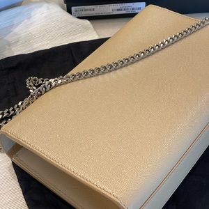 In very good condition. Has only been used a handful of times and has no scratches. Authentic Saint Laurent Bag: Beige with silver chain. Includes box, dust bag, and booklet.