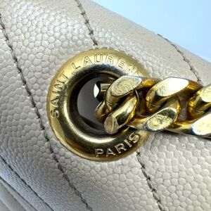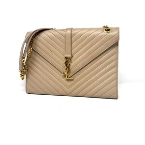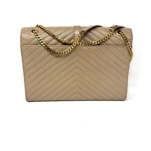 Elevate your wardrobe with this authentic SAINT LAURENT Envelopes Grain De Poudre Matelassé Chevron Large Monogram Satchel in timeless beige grained calfskin leather. This luxurious shoulder bag features gold-tone chain link straps with leather shoulder pads for comfort and an elegant envelope-style flap adorned with the iconic YSL monogram closure.