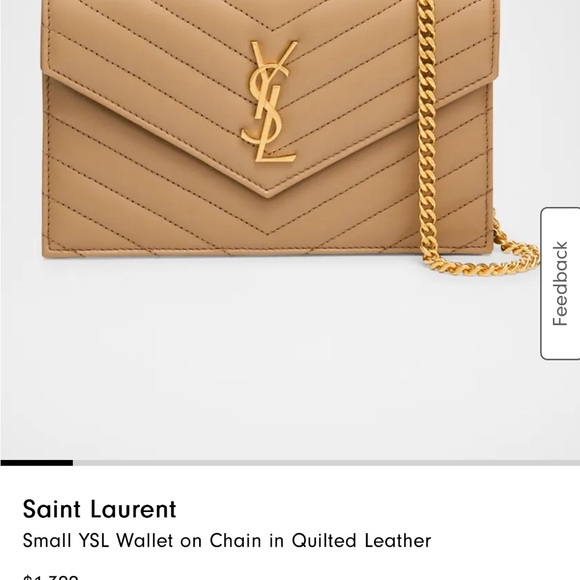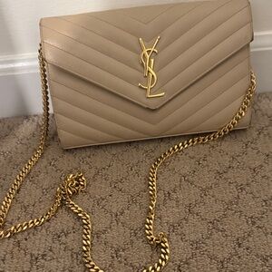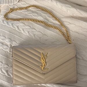 Chic Saint Laurent wallet with quilted leather. Features iconic YSL logo and gold chain strap. Perfect for stylish outings.