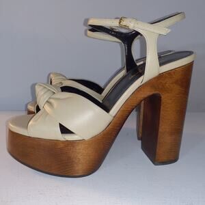 Saint Laurent 'Bianca' Tan 85 Knotted Sandals Size OS: nude leather open toe branded insole side buckle fastening knot detailing high block heel platform sole.