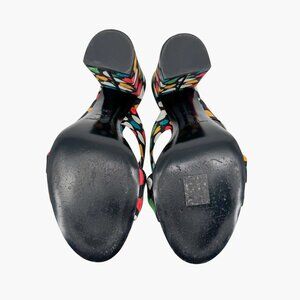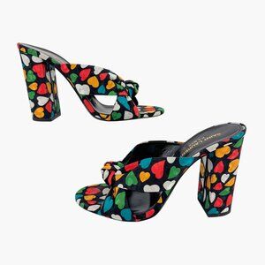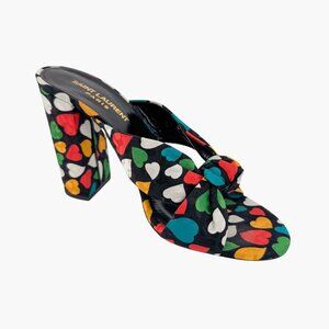 These Saint Laurent Bianca 100 mule sandals feature black satin uppers with a playful multicolor heart print. Designed with a knotted strap, open round toe, and high block heel, they bring a fun yet sophisticated edge to summer outfits, resort wear, or evening looks.