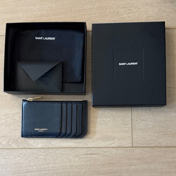 Sleek black card holder by Saint Laurent. Features a stylish gold zipper. Ideal for organizing cards with sophistication.
