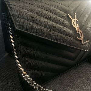 In excellent pre loved condition. Worn 2x. Hardly any signs of wear on corners, hardware, interior and cavas as seen in the pictures. Ships with dustbag and authenticity card. This exquisite Saint Laurent clutch showcases a deep black color and a structured envelope-like shape. Crafted from smooth leather, it features a distinctive chevron quilting pattern and a prominent silver-toned YSL logo on the front. The elegant chain strap allows for versatile styling, making it a perfect accessory for any occasion.