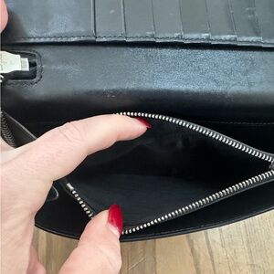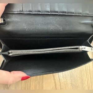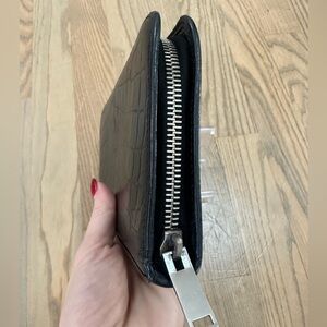 This zip around wallet from the house of Saint Laurent is fashioned in leather with exotic crocodile embossment all over. This petite yet functional wallet opens to reveal a single compartment along with multiple card slots and a zipped coin pouch.