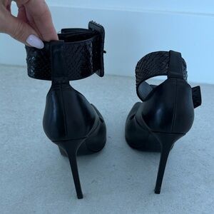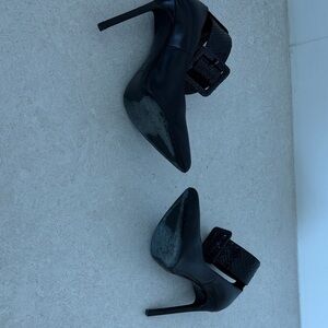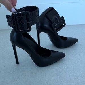 Elegant black heels with a bold buckle. Perfect for a sophisticated look.