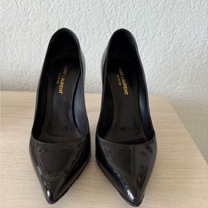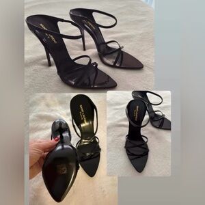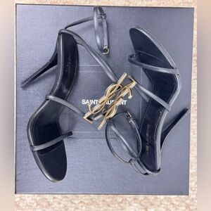 Chic Saint Laurent heels. Sleek black with gold details. Perfect for any event.
