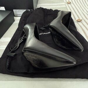 Chic black heels by Saint Laurent. Features signature logo heel design. Perfect for a stylish statement.