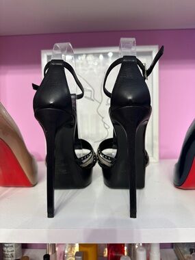 Elegant pointed-toe stilettos in smooth black leather. Narrow high heel and sculpted silhouette. Ankle strap with buckle for a secure fit. Sophisticated, minimalist design for evening or dresswear.