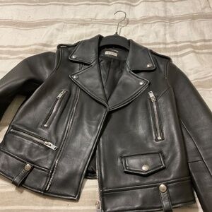 Sleek black leather jacket. Features classic biker style. Silver hardware accents. Perfect for edgy looks.