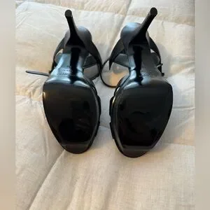 Saint Laurent platform sandals in black leather. Strappy front with ankle buckle. Gold YSL logo on insoles. Sleek high-heel silhouette for dressy looks.